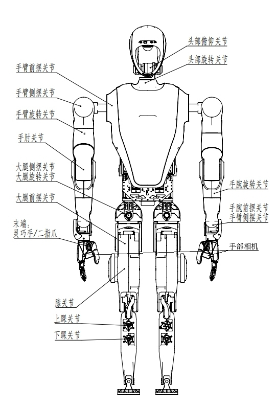 单手臂拥有7个自由度,包含手臂前摆关节、手臂侧摆关节、手臂旋转关节、手肘关节、手腕旋转关节、手腕前摆关节和手腕侧摆关节。手臂可选配末端二指爪/灵巧手