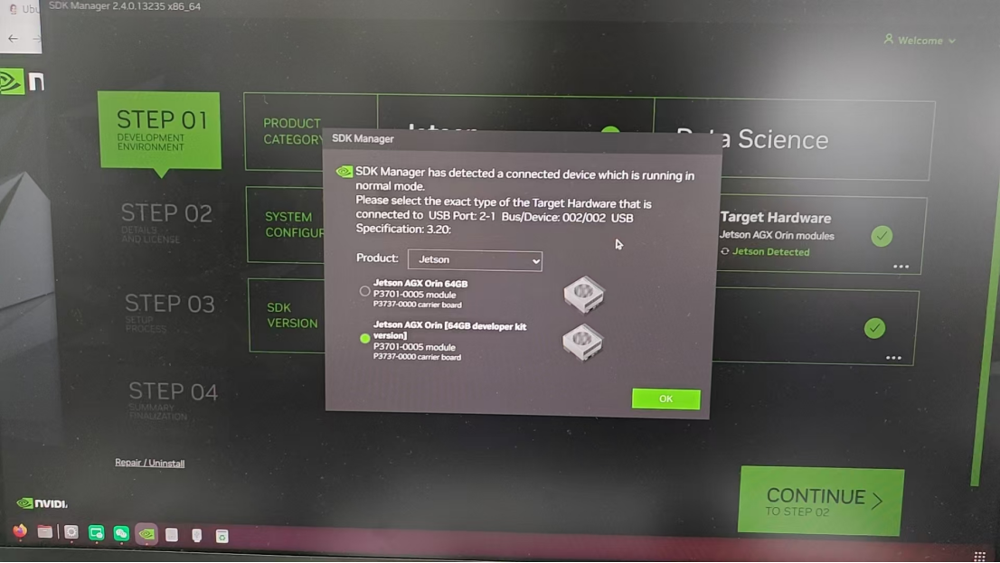 在终端中输入以下指令,打开NVIDIA SDK Manager